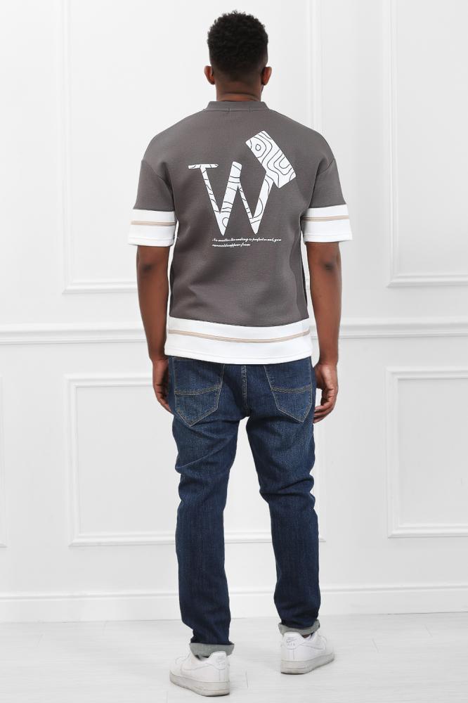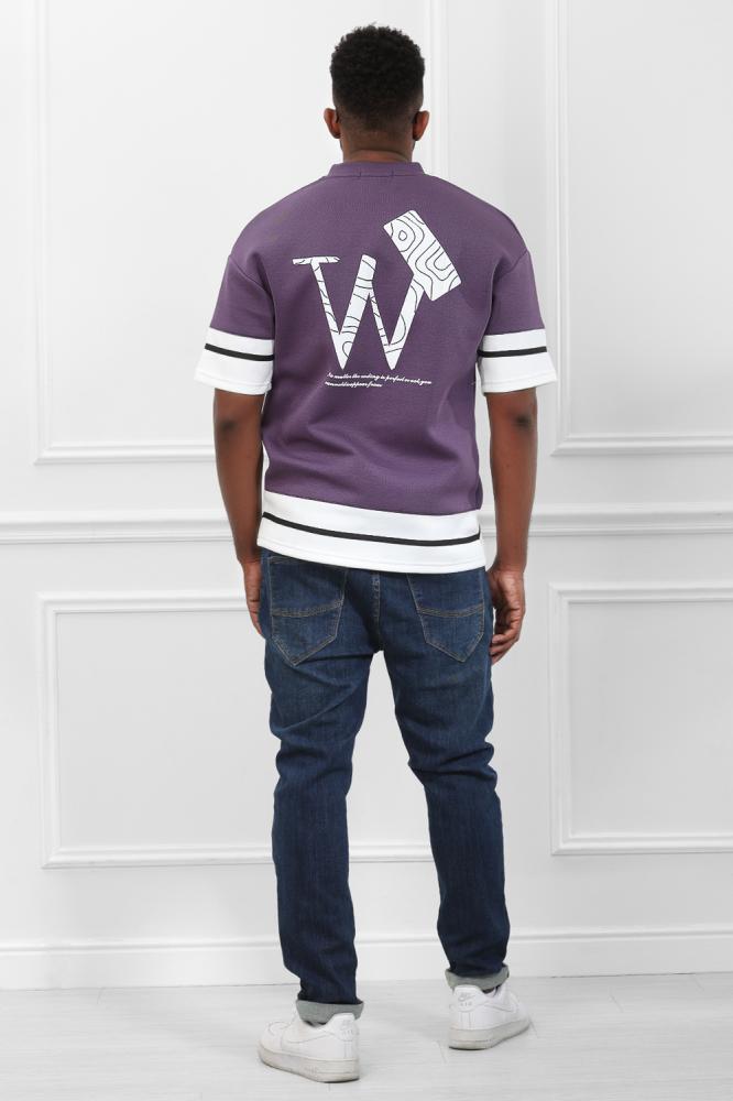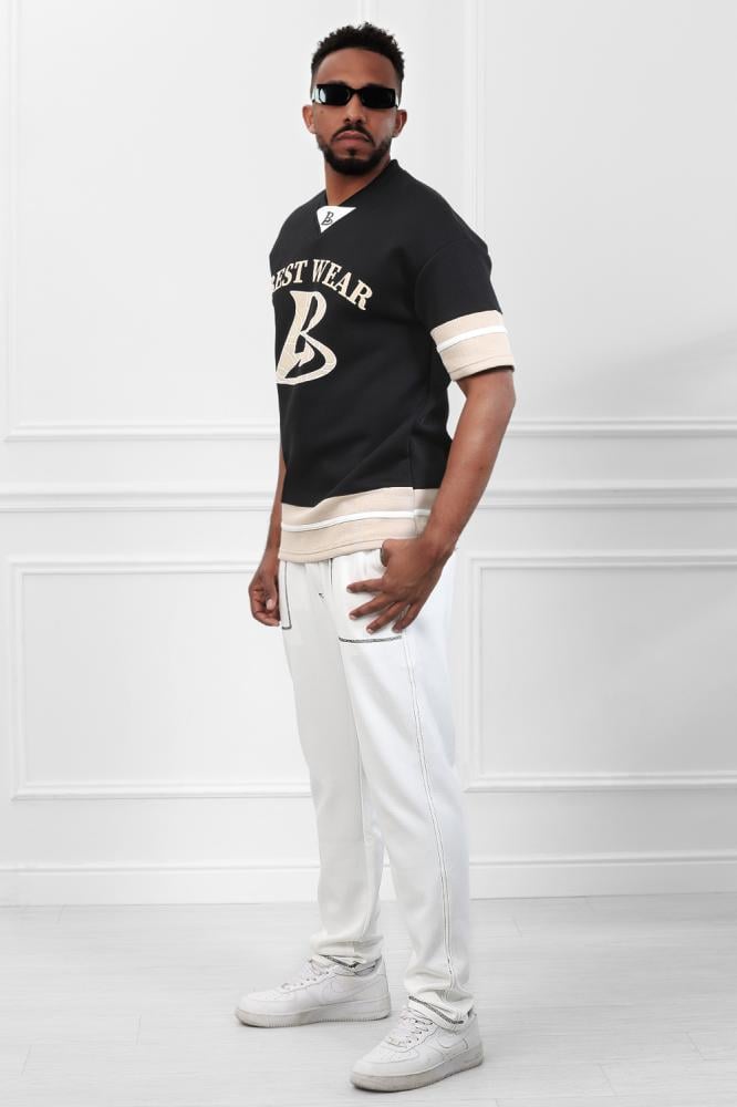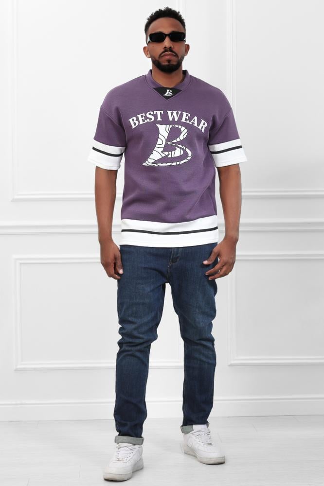 - تصميم أنيق: يأتي التيشرت مزينًا بخطوط بيضاء وكريمية على الأكمام وأسفل التيشرت، مما يضفي لمسة عصرية.