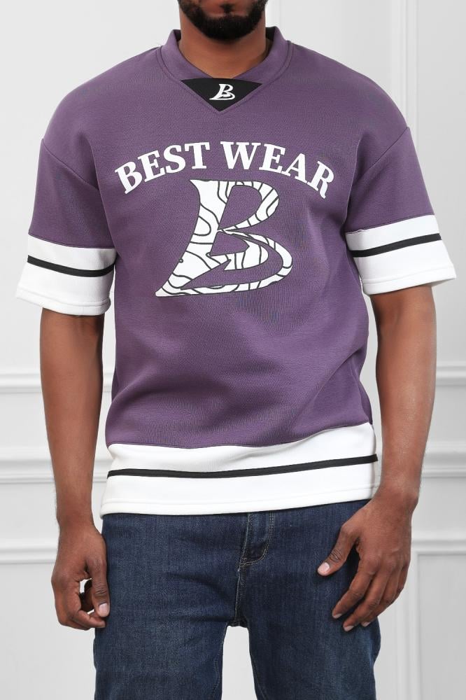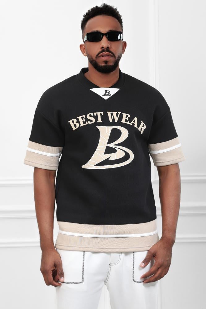 تيشرت اوفر سايز رجالي هو الخيار المثالي لمن يبحث عن الراحة والأناقة في آن واحد. يتميز هذا التيشرت بقصة مريحة ورقبة على شكل حرف V، مما يجعله مناسبًا لمختلف المناسبات. التصميم بسيط ولكنه جذاب، حيث يُظهر شعار "BEST WEAR" بلون ذهبي لامع، مما يضفي لمسة من الفخامة على مظهرك.