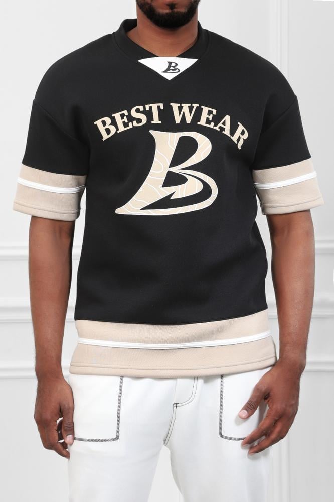 - شعار بارز: الشعار الذهبي المطبوعة على شكل حرف B يبرز هوية العلامة التجارية ويجعل التيشرت مميزًا.