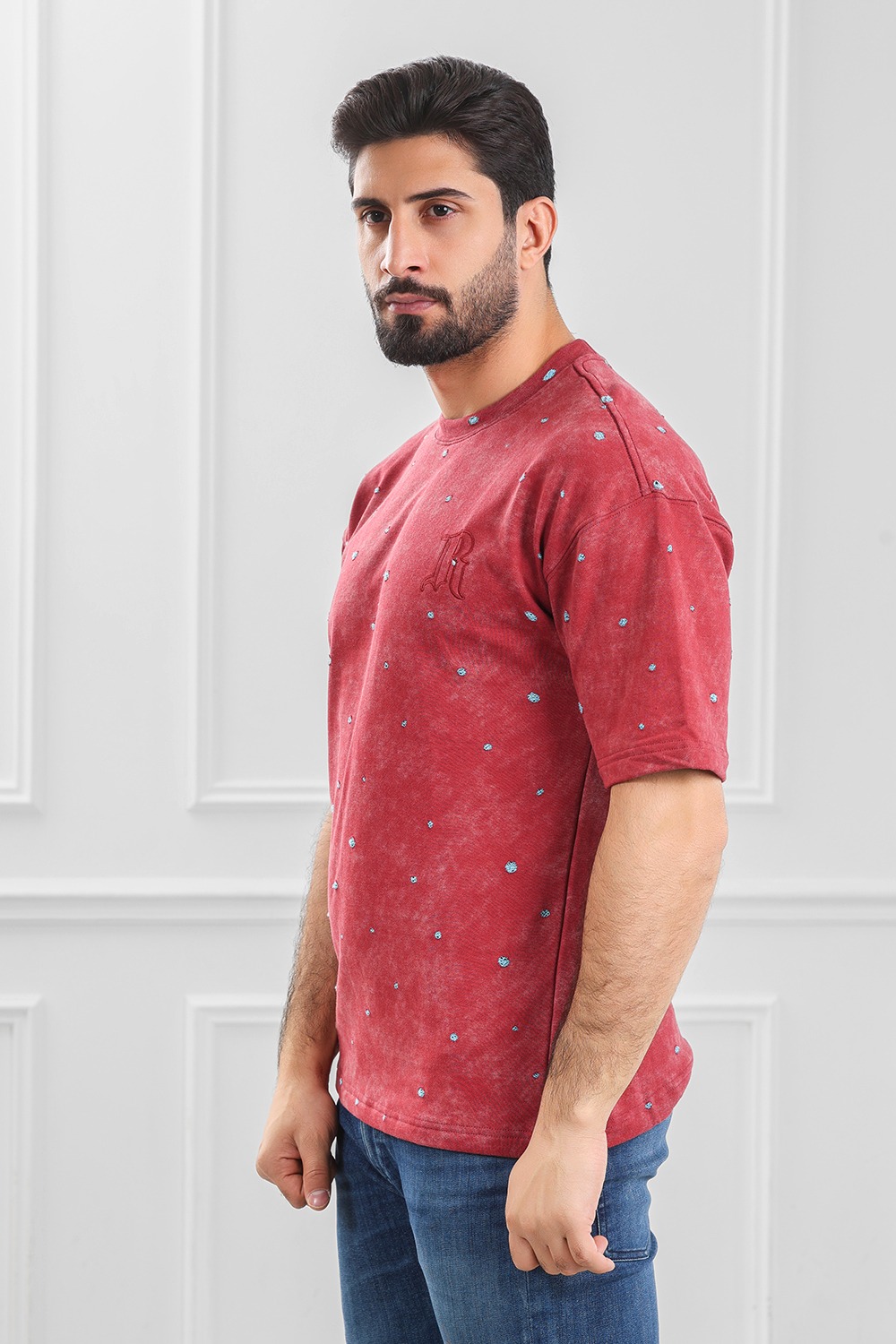 تيشرت رجالي أوفر سايز مغسول مزين بطبعات دائرية صغيرة