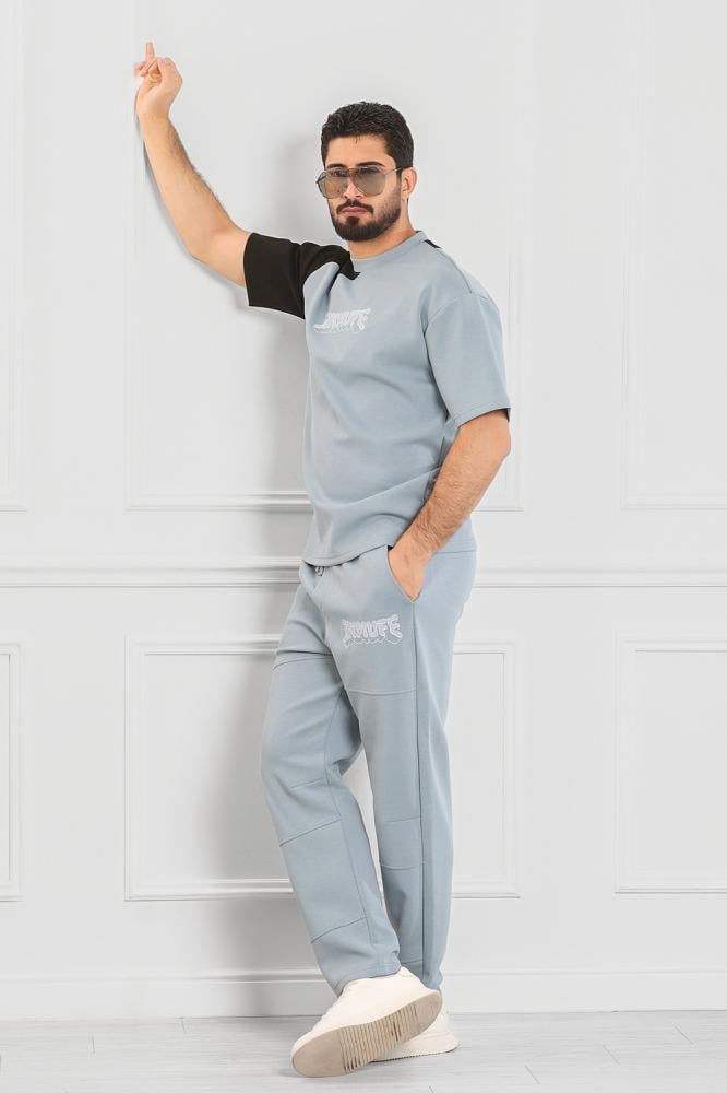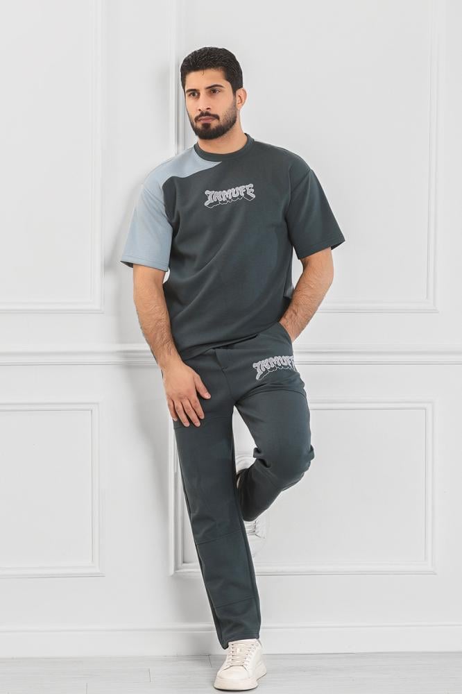 - شعار رئيسي على صدر التيشرت بخطوط جريئة وشعار مطابق على جانب البنطلون