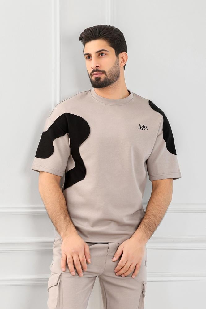 - التيشرت: تصميم كلاسيكي بدون ياقة + شعار "Me" الصندوقي بخطوط أنيقة على الصدر.