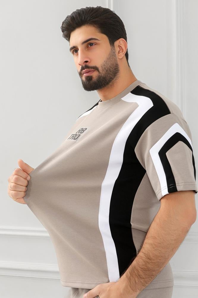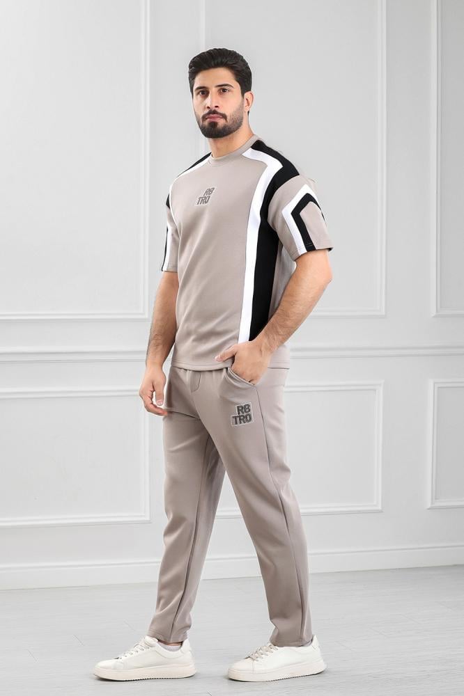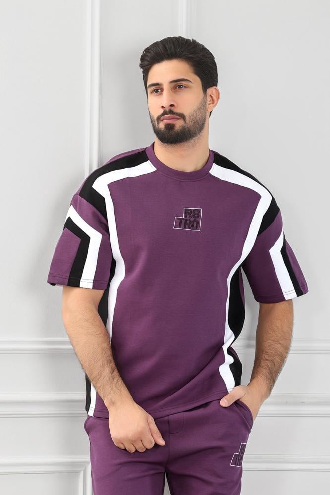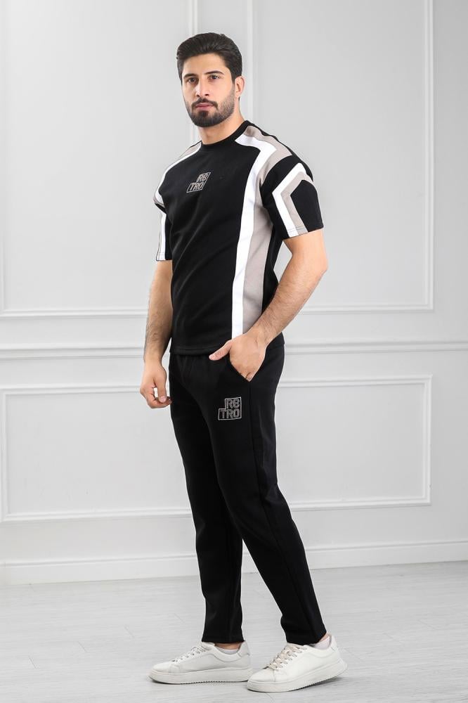 - التيشرت: خطوط متقاطعة على الكتفين والأكمام، مع شعار العلامة "RETRO" الأمامي بخطوط عريضة.